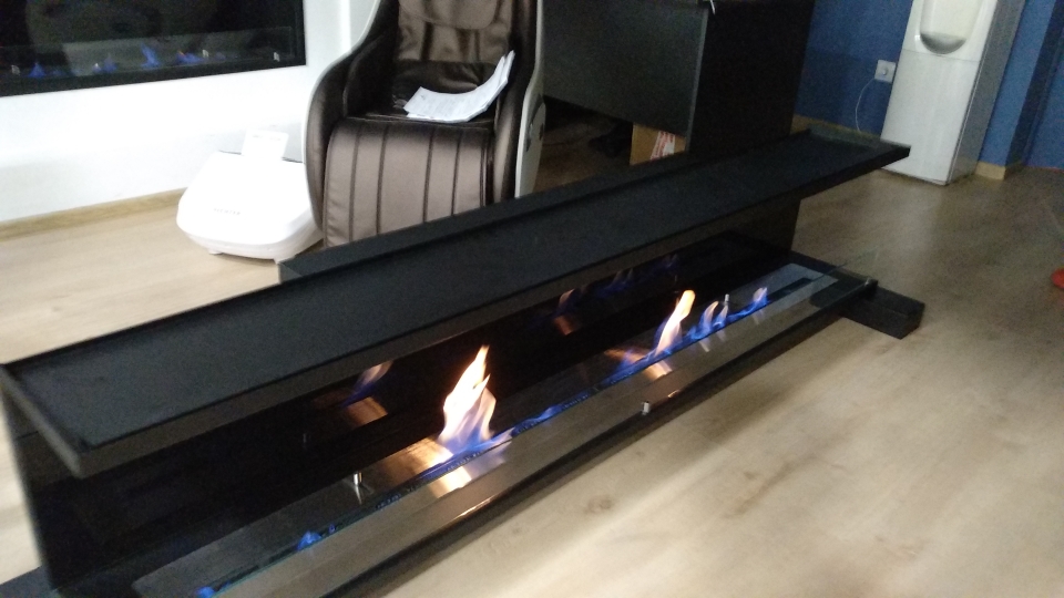 По проекту дизайнера изготовили шикарный торцевой биокамин внушительной длинны 2 метра. Размер топливного блока также впечатляет - 1,7 метра. Срок изготовления две недели.